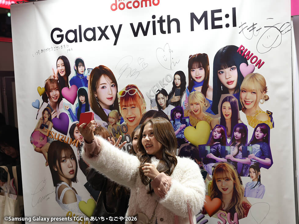 Samsung Galaxyブースでは、Galaxyでドコモの「ミリ波」を体験できる様々なコンテンツをご用意。ME:Iがスペシャルステージで初披露したばかりの「Best Match」の、7人それぞれにフォーカスした推しカメラ映像を、「ミリ波」を使ってその場で高速ダウンロードできたり、Samsung Galaxy Z Flip7の手のひらシャッター機能を使ってME:Iのサイン付きフォトパネルで写真が撮れたりと、ドコモのGalaxyでME:Iの推し活を堪能できる大盛況のブースとなりました。