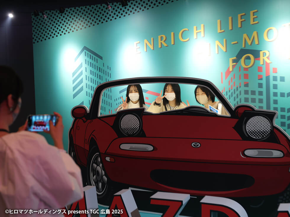 マツダ ロードスターのコミカルなフォトパネルが初登場!ちょっとレトロなオープンスポーツカーで都会のドライブを楽しんでいるような写真が撮影できたり、カーブミラーを使った写真スポットも来場者に大人気♪写真を撮影してSNSをフォローしたり写真を投稿してくれたりした来場者にはスペシャルギフトも贈られ大盛況のブースとなりました!