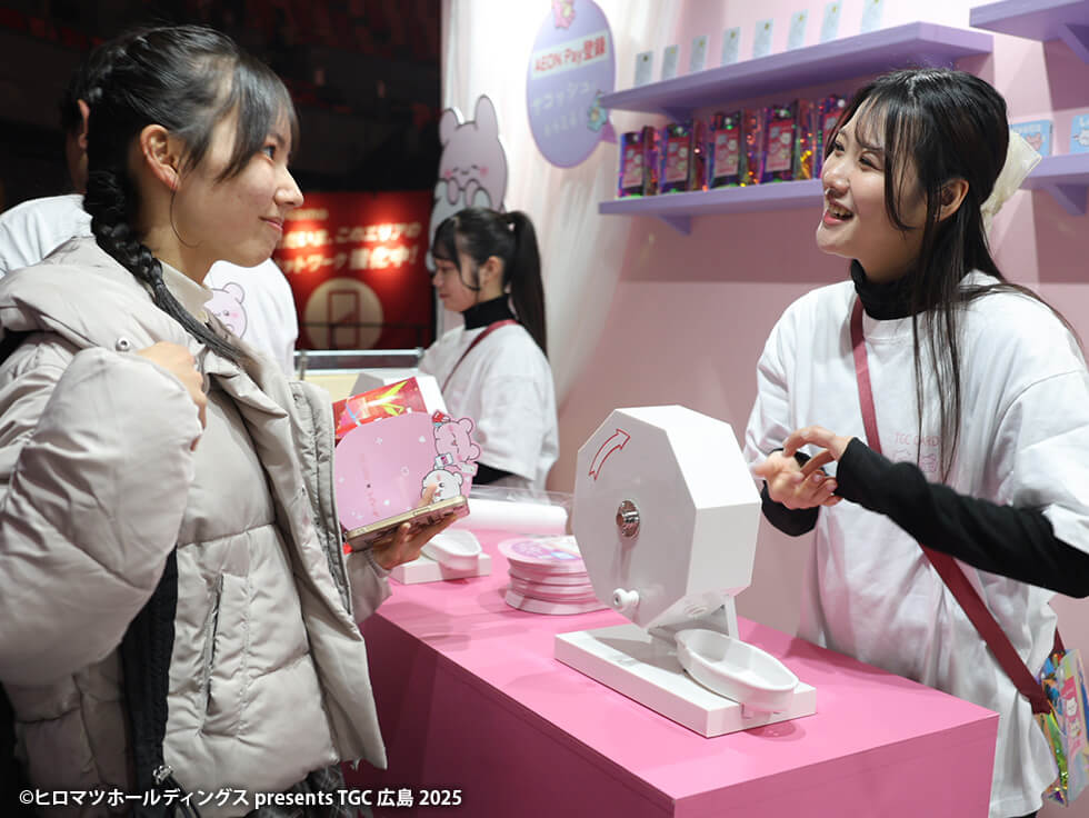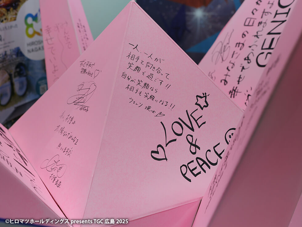 広島市のブースでは、冬の夜空に折り鶴を散りばめたTGCコラボフォトスポットや出演者直筆のピースメッセージも展示され、多くの来場者と平和への思いを共有しました。その他、広島広域都市圏のゆるキャラグッズや名産品のプレゼントもあり、盛りだくさんのブースとなりました!