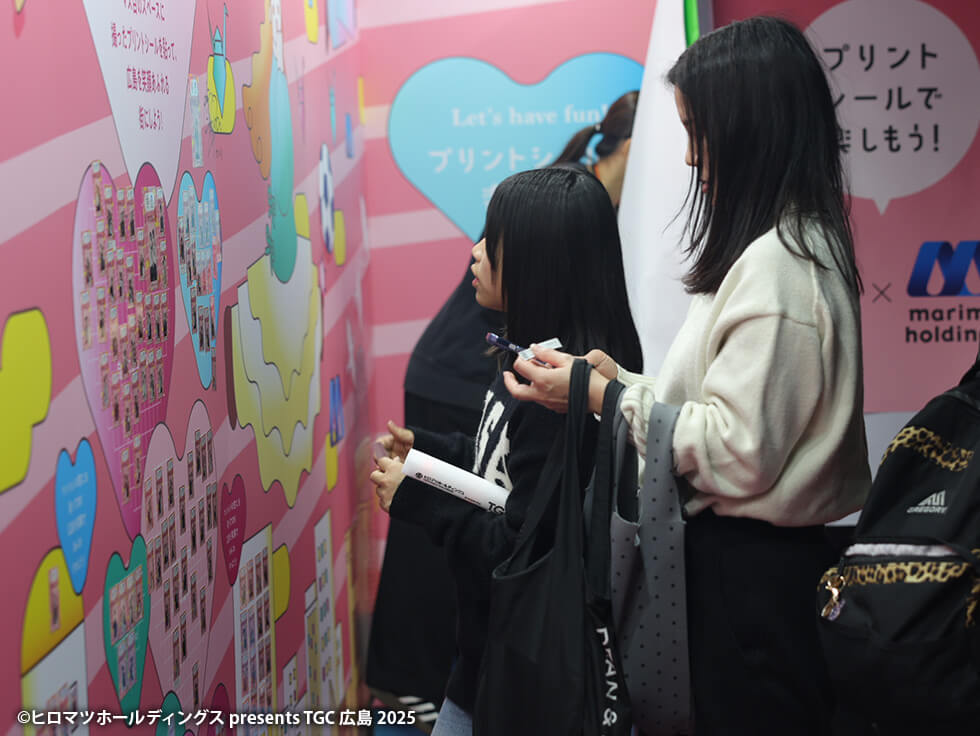 「ヒューマニティとビジネスの力で社会の課題を解決し、人々の豊かな暮らしを創造し続ける。」をパーパスに掲げ、不動産事業を中心に様々な事業を展開する、株式会社マリモホールディングスのブースでは街づくりをテーマにした参加型アートブースが登場!人気イラストレーター・桃色ポワソンが手がけた、広島の街並みをモチーフにしたカラフルでPOPなブースでは、オリジナルプリントシールの撮影もできるとあって大人気に♡撮影したプリントシールはビジュアルに貼り付けることができ、笑顔溢れるブースとなりました!