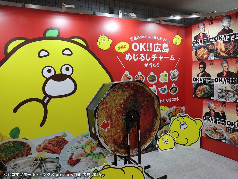 広島のおいしい!食べ物のアクリルチャーム(全10種)がもらえる抽選会を実施しました。『コウネ』、『がんす』、『くわい』など、知らなかった広島のおいしい!に出会えた人も!広島グルメに夢中なHITひろしま観光大使「ひろくま」と巨大お好み焼の写真を撮る方もいらっしゃり、広島の多彩な食の魅力を感じていただけるブースとなりました。